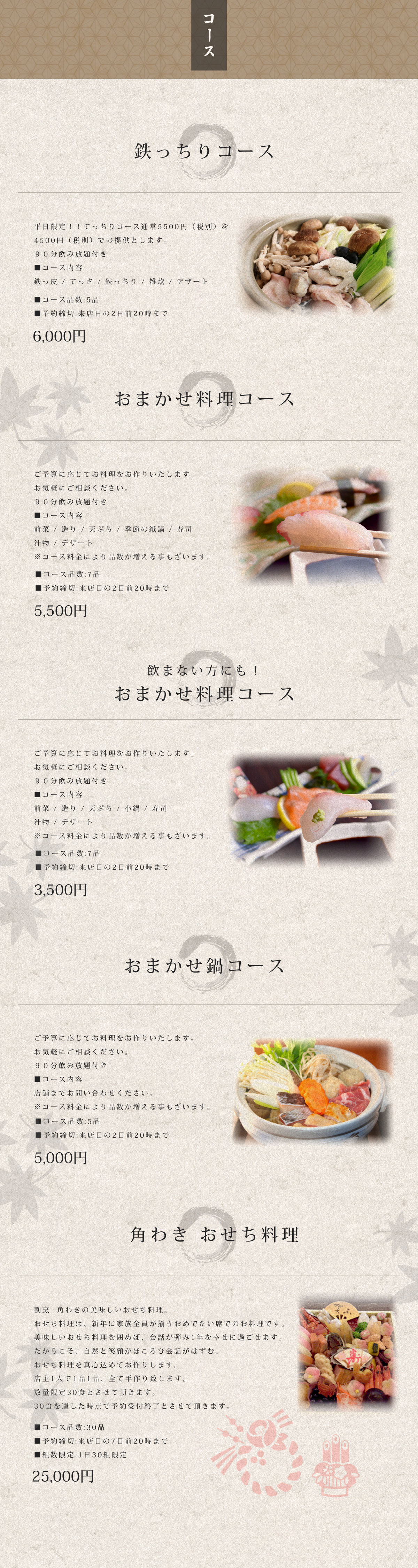 店主が毎日厳選している海鮮は、地元で水揚げされたばかりの鮮魚のみを仕入れております。季節の食材を使用し、旬を感じて頂くお料理の数々をご用意しております。コース料理3500円~(飲み放題+1500円)一品料理など400円~割烹料理ですが、リーズナブルな料金設定です。お気軽にお越しください。