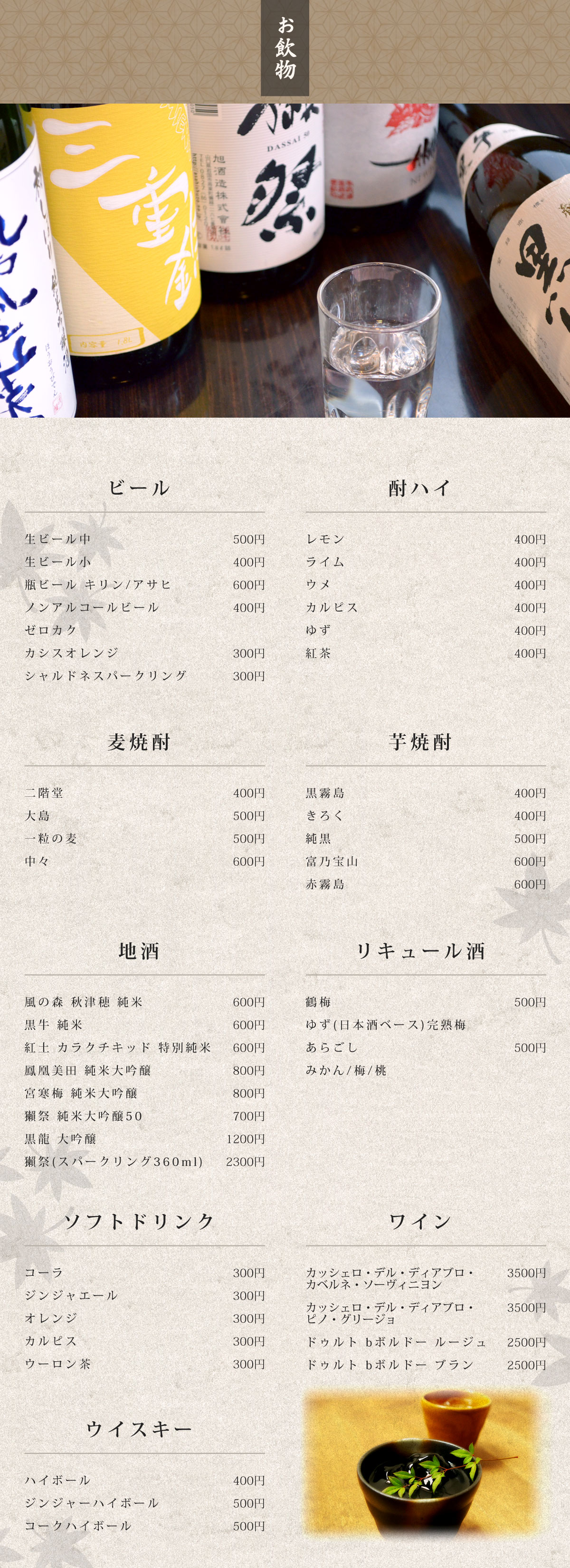 お料理と合わせた旬の日本酒をお楽しみいただけます。日本酒は、すべて店主が試飲しお料理との相性を吟味して厳選しました。焼酎各種、酎ハイもご用意しております。