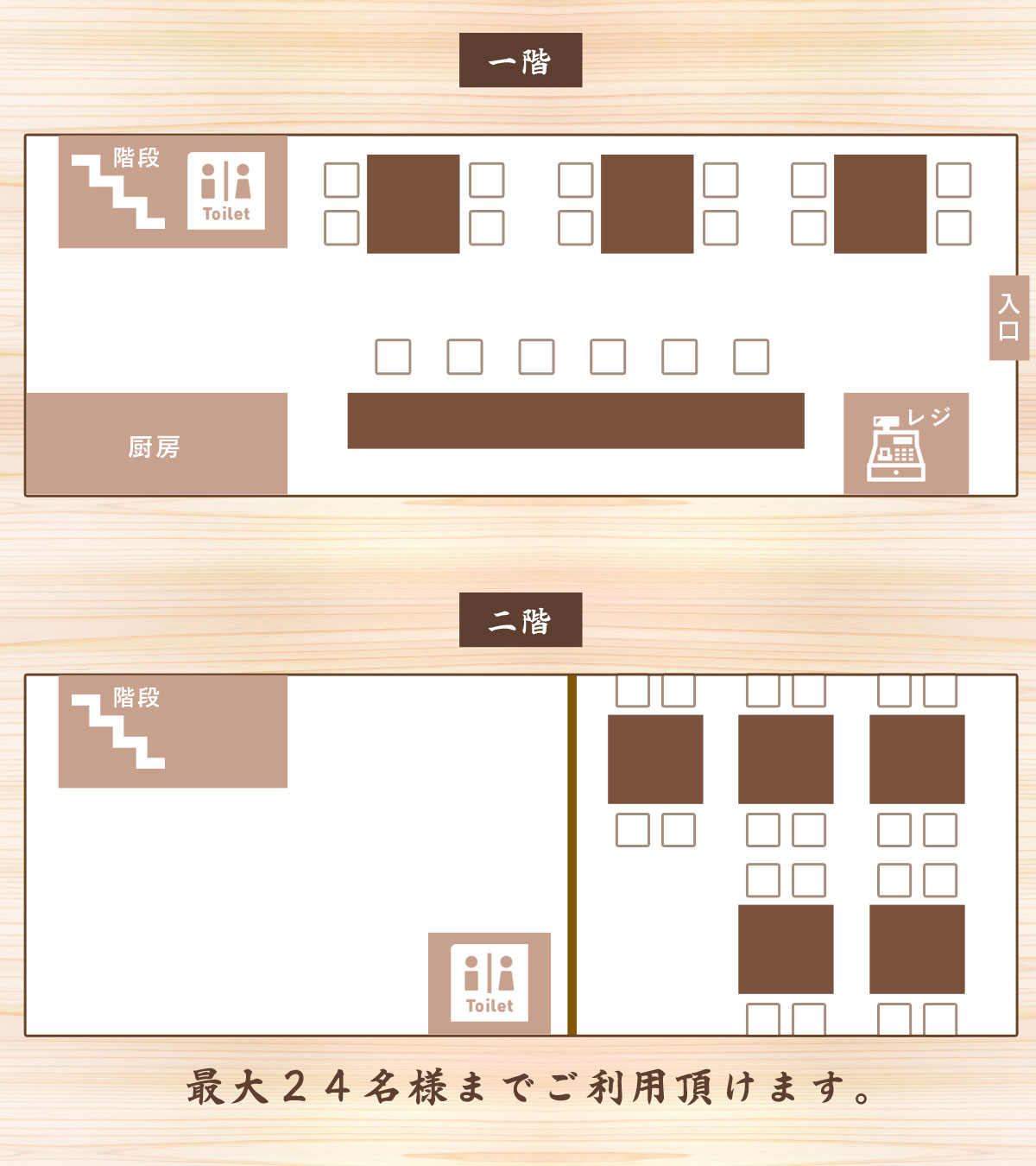 1F席は、ご家族・接待などテーブル席で落ち着いた空間です。カウンターもあり、お一人様でも気軽にお越し頂けます。2F席は大広間になっており、会社様をはじめ女子会・慶次・法事・各種宴会も最大24名様までご利用頂ける、広々とした個室もご用意しております。お気軽にご予約ください。