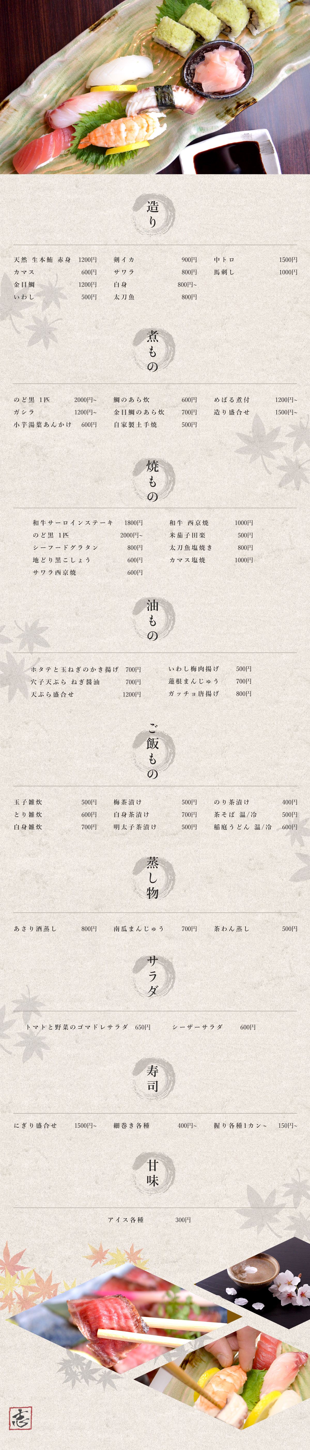 店主は鮨の老舗店で修行し、この店をOPENしました。衛生面はもちろん、魚の目利き・下処理・接客など、修行時代に習得した技術は、この店の色となって生かされております。落ち着いた空間の中、割烹料理に舌鼓を打ってください。